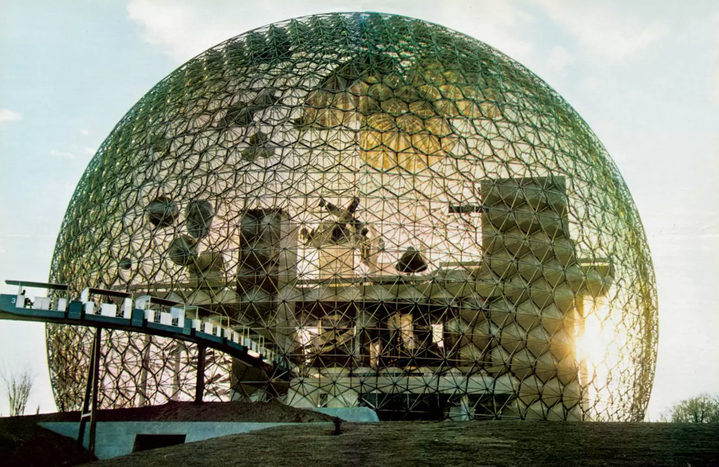 Buckminster Fuller Geodesic dome for the 1967 World Expo in Montreal that symbolized futuristic, sustainable design. His structures championed efficiency and "doing more with less," .
